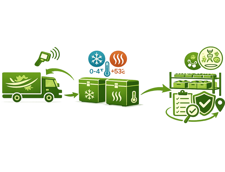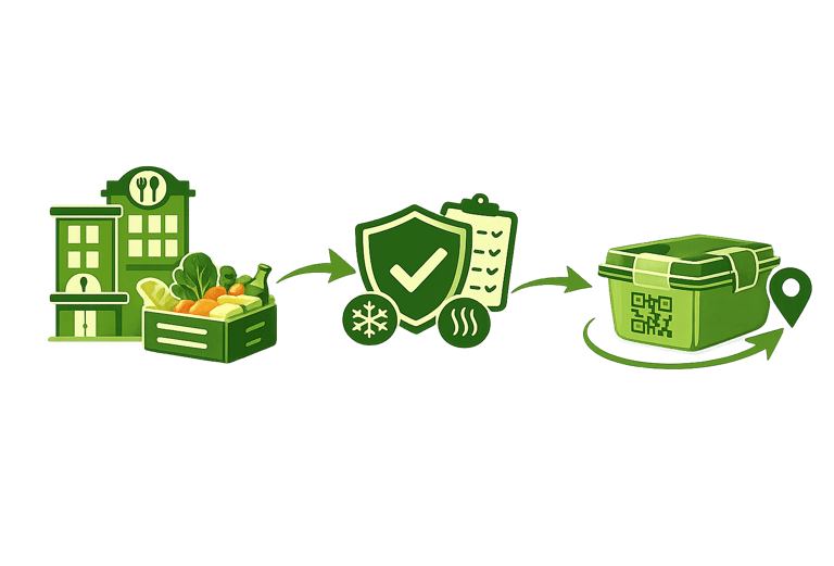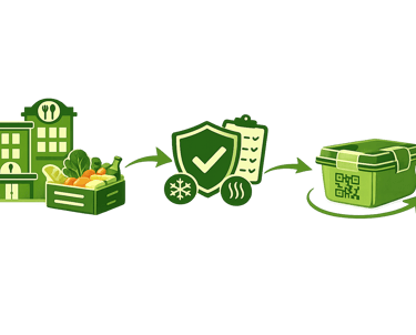Food is then packaged in certified, traceable containers with QR codes, allowing full traceability from source to final delivery.
