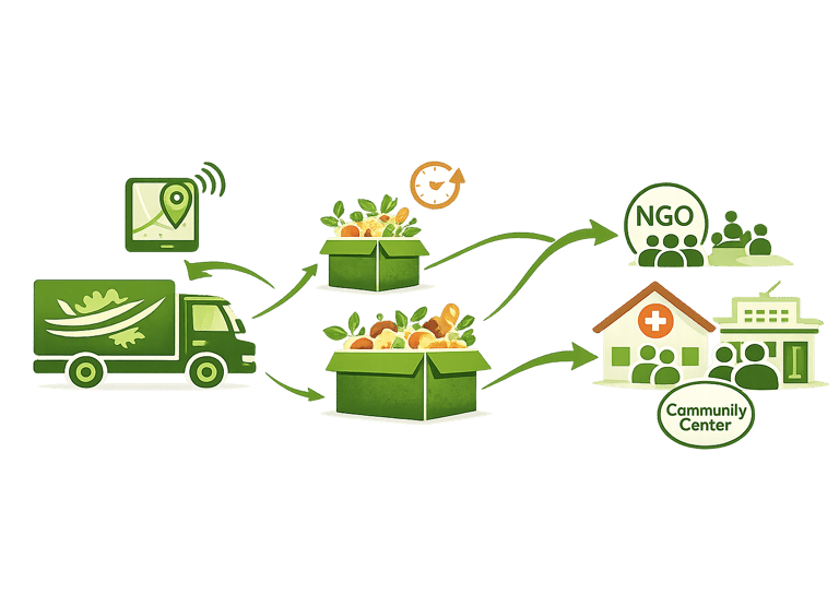 This end-to-end process transforms surplus food into a safe, traceable, and high-impact social resource.